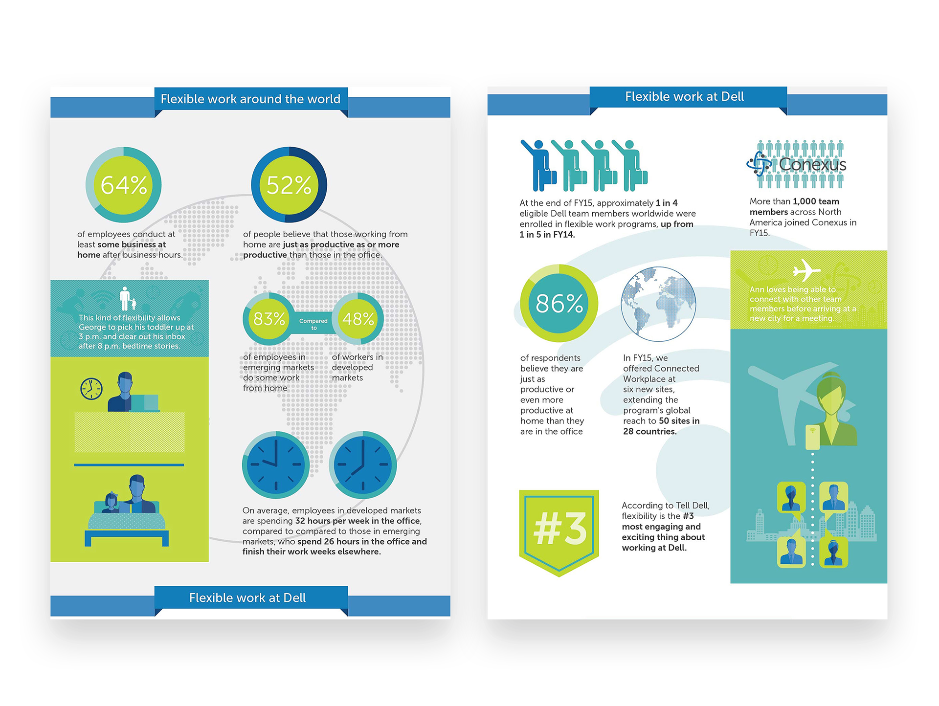 Connected Workplace is an internal organization at Dell that promotes flexibility among Dell employees. This flexibility includes remote access, flexible work days, flexible work weeks, shared responsibilities and more. The program was established but was not well known by employees and was not something many felt they were able to approach their manager about being a part of. The initial phase of the awareness campaign internally and externally, was to establish a visual identity based on the collected data and testimonials regarding what the program has done to change employees work lives. It was set to appeal as a perk in considering building a career at Dell. A major component the Director of HR (Mohammed Chahdi) is to drive the function of CW as a tool to enable trust of employees to choose the best way to do their job, as people all have different methods of working and being productive with respect to their personal conditions. Important as well, was to disassociate remote work the widely held perception that working remotely means you're not working as hard as those in the office 40 hours a week. The Connected Workplace campaign was initiated to promote the many benefits of flexibility at Dell as a broader concept. The design concept centralizes around the needs of the individual and situates CW as a negotiator between work life and home life. An illustrative approach helps give character to employees utilizing flexible work programs and tell a story. The wordmark incorporates a human bust surrounded by connection points. This conveys connectivity to others, the employee's environment, and gives a nod to the complexity of each individual's needs. The bust of the person incorporates a heart shaped torso to also subtly reinforce that CW is rooted in Dell's care for its employees and addresses the needs of the individual. This is all intended to promote the idea that when the individual employee is happy, he/she is productive, and when employees are productive, the company's prosperity is facilitated. Part of the ongoing campaign was compiling a video of testimonials to demonstrate how many different situations and contexts people are able to maintain as a Dell employee, and not sacrifice work/life balance. The deliverables I created also included a distinguished branding system with a new wordmark/logo, PowerPoint cover slides and divider slides, and promotional business cards for Talent Acquisition. The client also requested a collection of data and create a well a modular infographic promoting flexibility, a global map of flexible Dell employees, and a timeline of Connected Workplace's evolution, rooted in the visual concept the client chose and used to tell the Connected Workplace story. This would all be used for events to amplify the campaign's objective of making CW a "household name" and concept in the workplace culture, as well as exemplify that your physical location or need for flexibility in your career search is something Dell created a successful system for addressing.