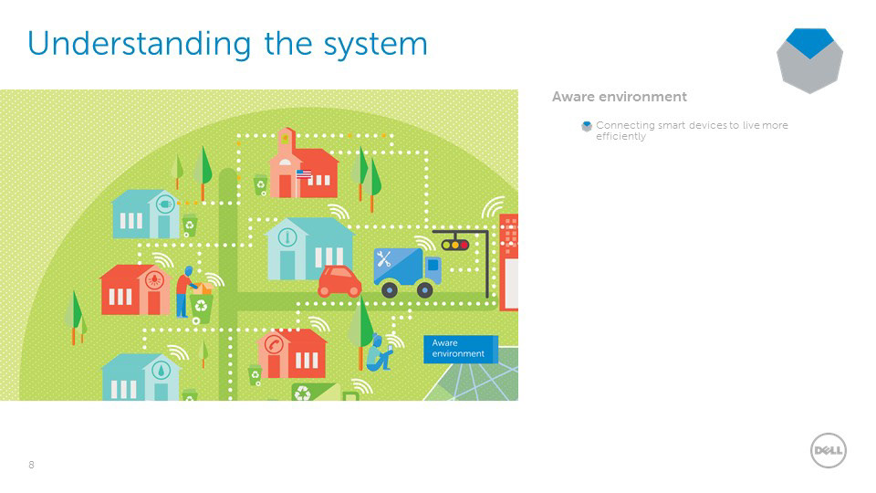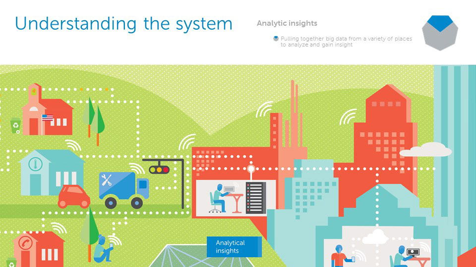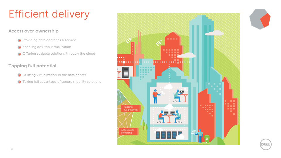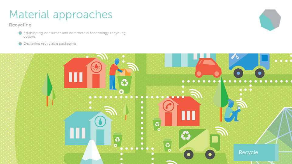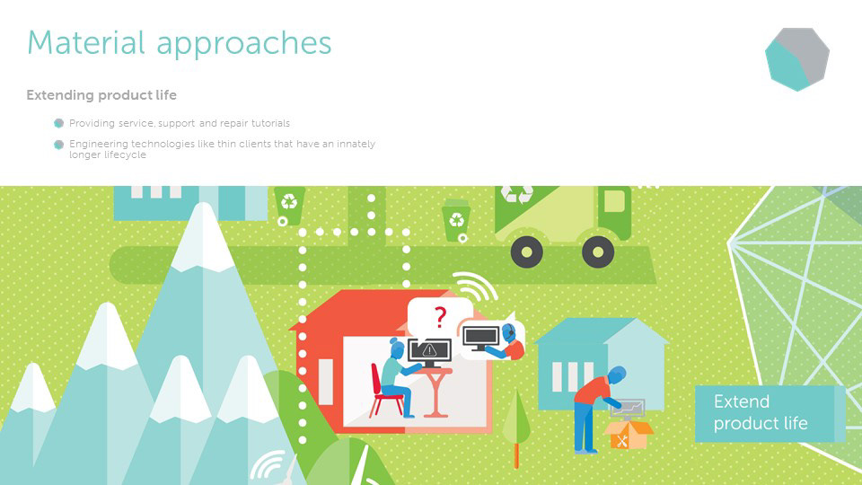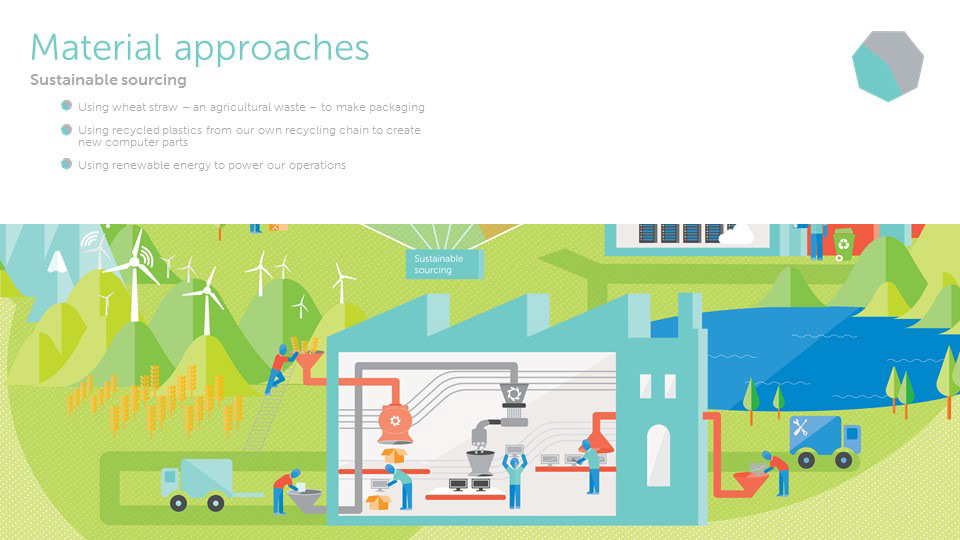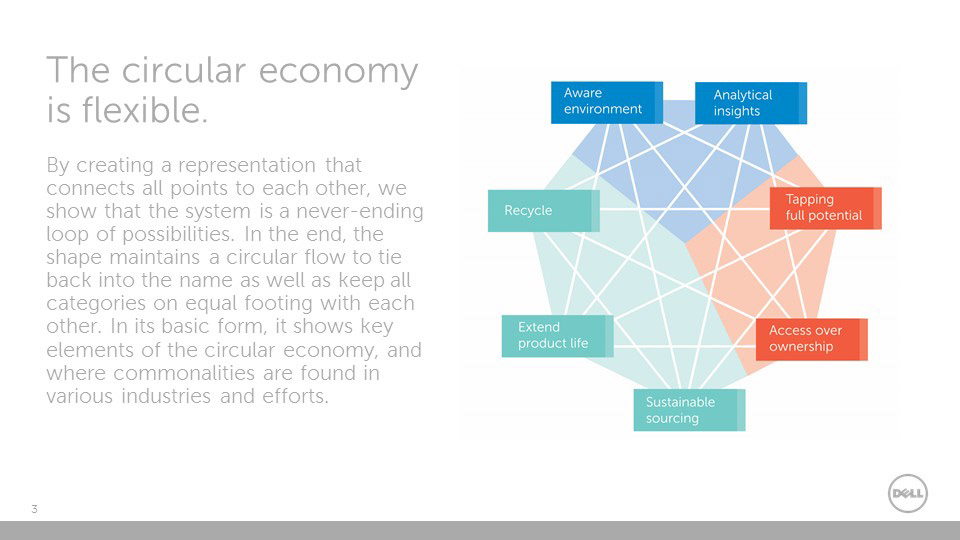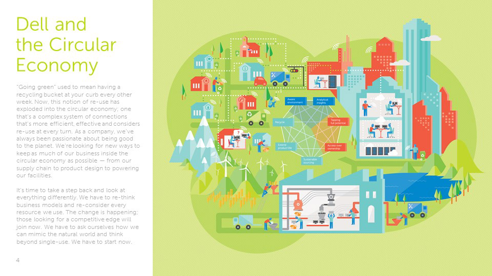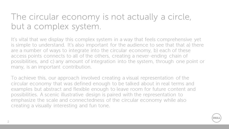 The circular economy is an extension of sustainability and a model that will allow us to be more efficient with all of our resources, and maximize their potential for use, in contrast to the old linear economy model. Dell is a leader in this approach as a technology company. From packaging and sustainable resource sourcing, to technological developments for gaining more analytical data, Dell is involved in each fundamental point on the circular economy web. In order to create an informative visual, it was necessary to develop an environmental illustration to enhance the digestibility of the concept. The circular economy is not actually a closed loop circle; each point in the web can interact directly or indirectly with another. The design takes this into account and expounds upon the versatility of the circular economy model.